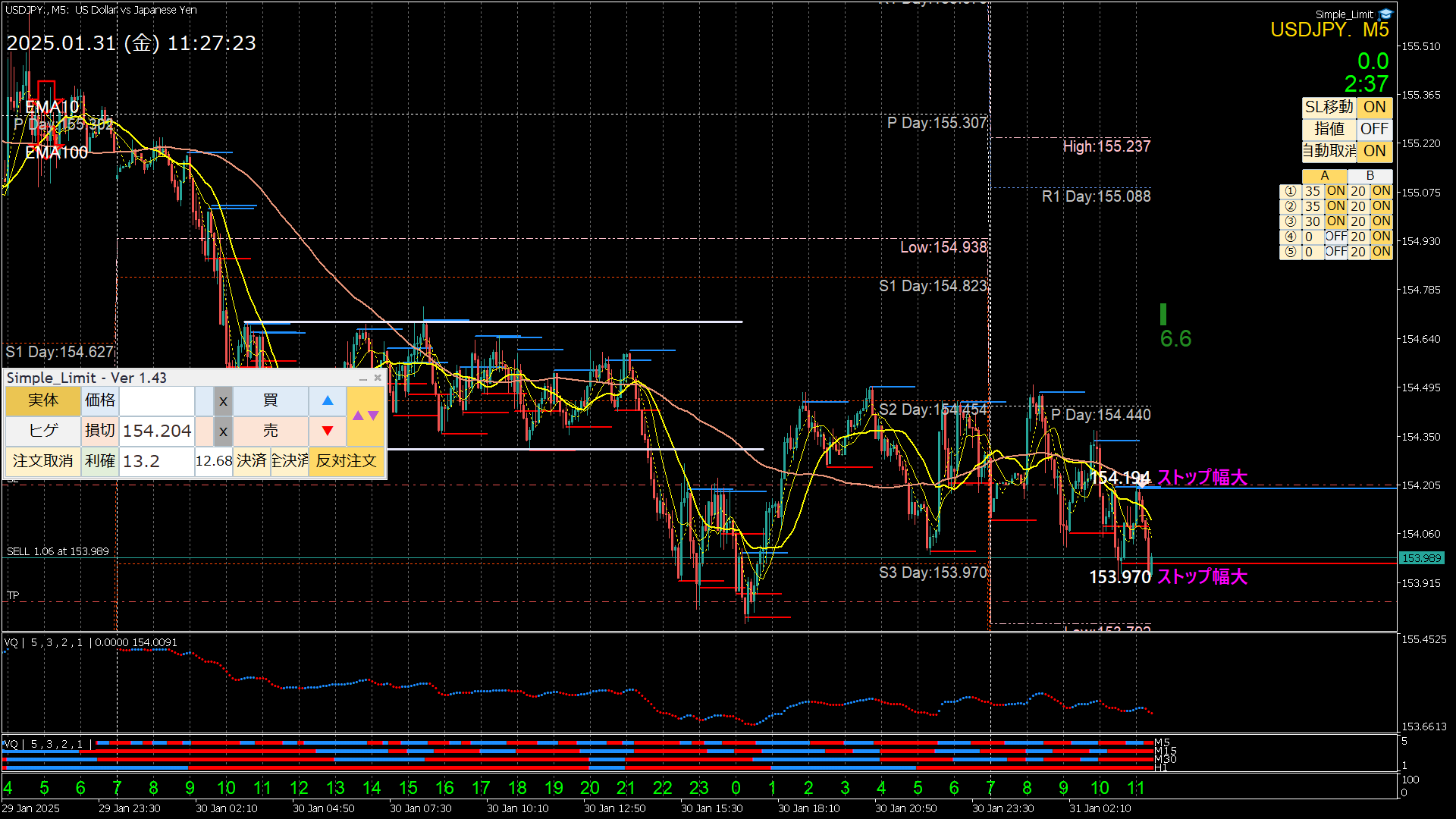 FX 2025年1月31日 Trade1 USDJPY データ&考察 エントリー時間 11:27 エントリー手法 リターンムーブ EMA10/100 一致 揉み合い基準値 6.6 M5トレンド Y...