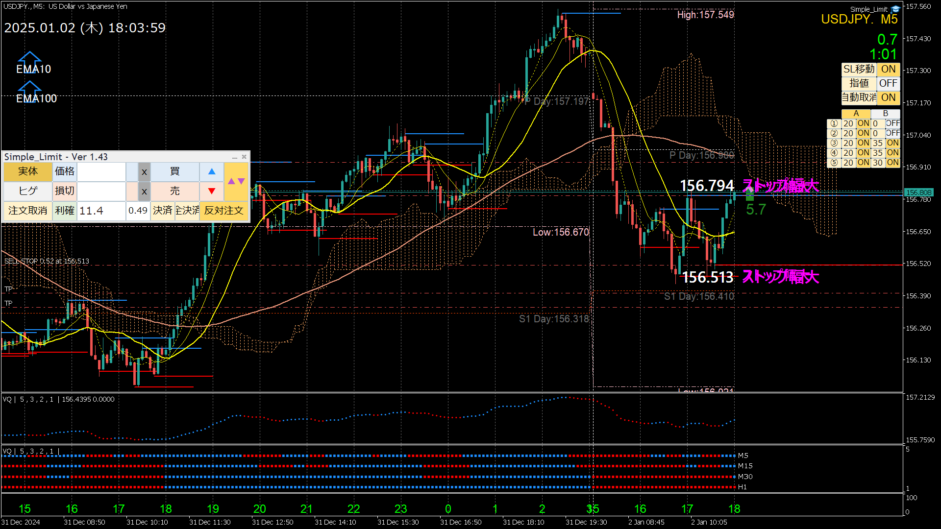 FX 2025年1月23日 Trade2 USDJPY データ&考察 エントリー時間 16:48 EMA10/100 一致 揉み合い基準値 3.3 トレンド No(雲の中でもある) エントリー# ...